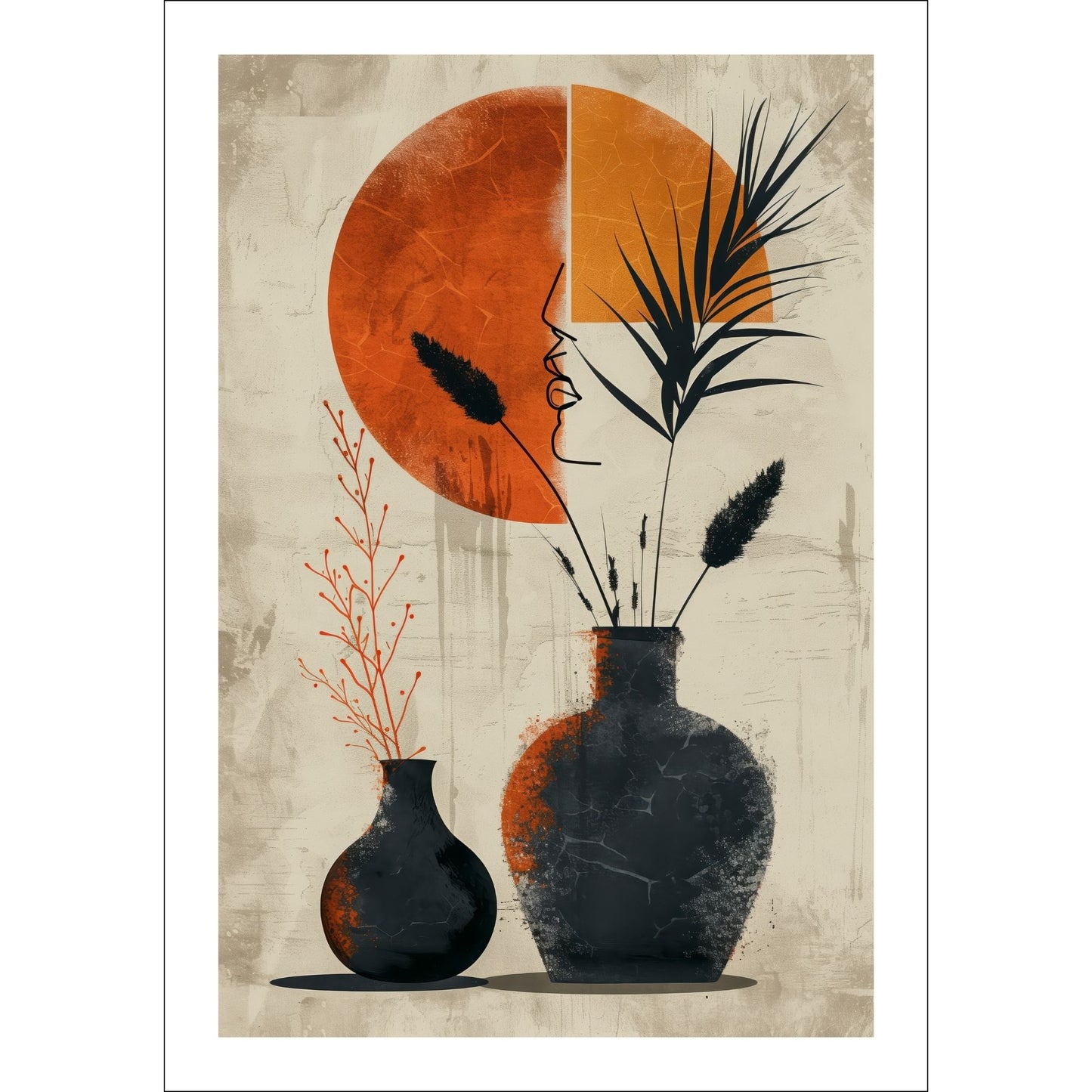 Dette unike kunstverket kombinerer stiliserte vaser med botaniske elementer i en varm og dempet fargepalett. Den abstrakte utformingen og de harmoniske fargene skaper en rolig, men samtidig iøynefallende estetikk som passer perfekt inn i både moderne og bohemske interiørstiler.