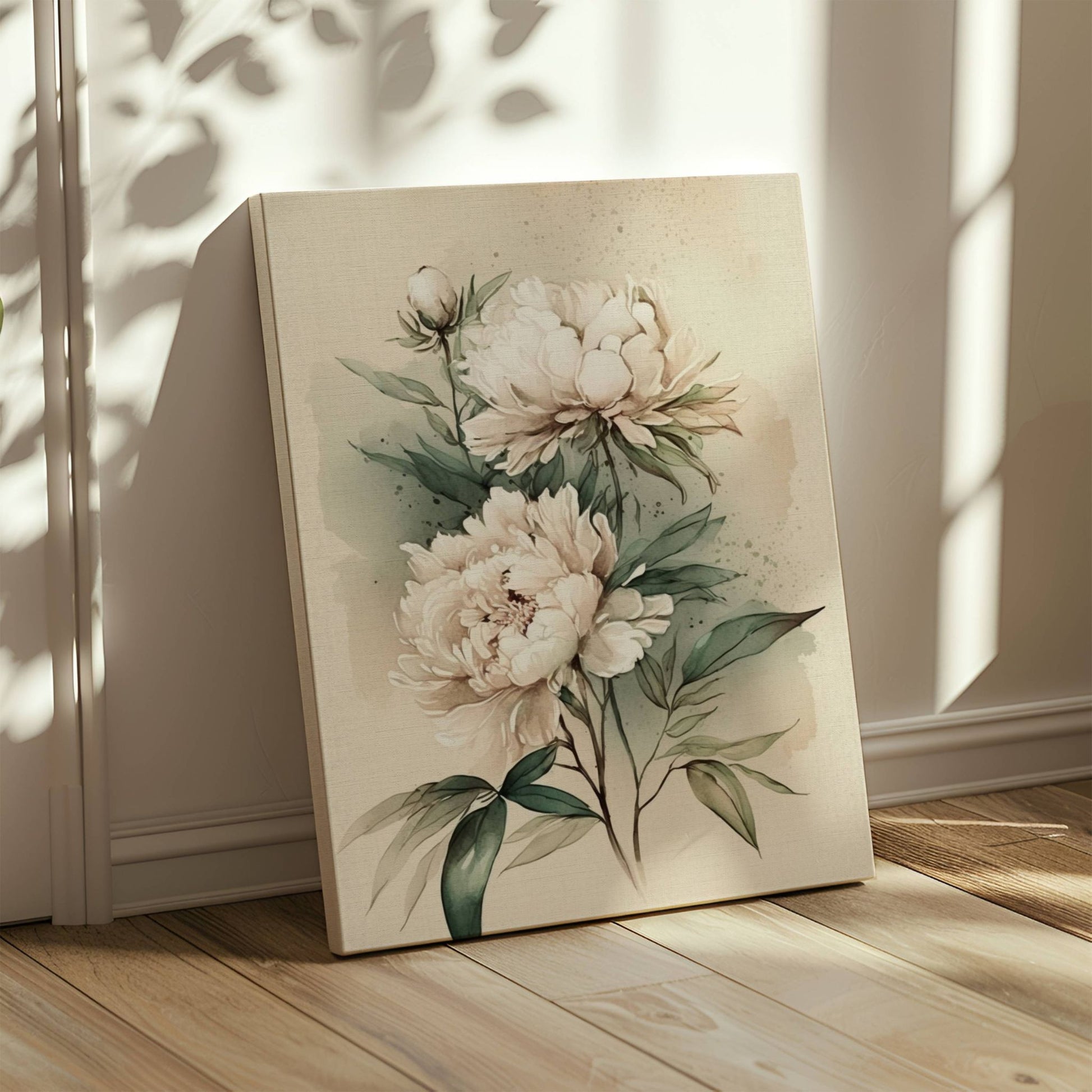 Akvarell Peonprakt No4 bringer naturens ynde inn i hjemmet med tre blomstrende peoner i perfekt balanse