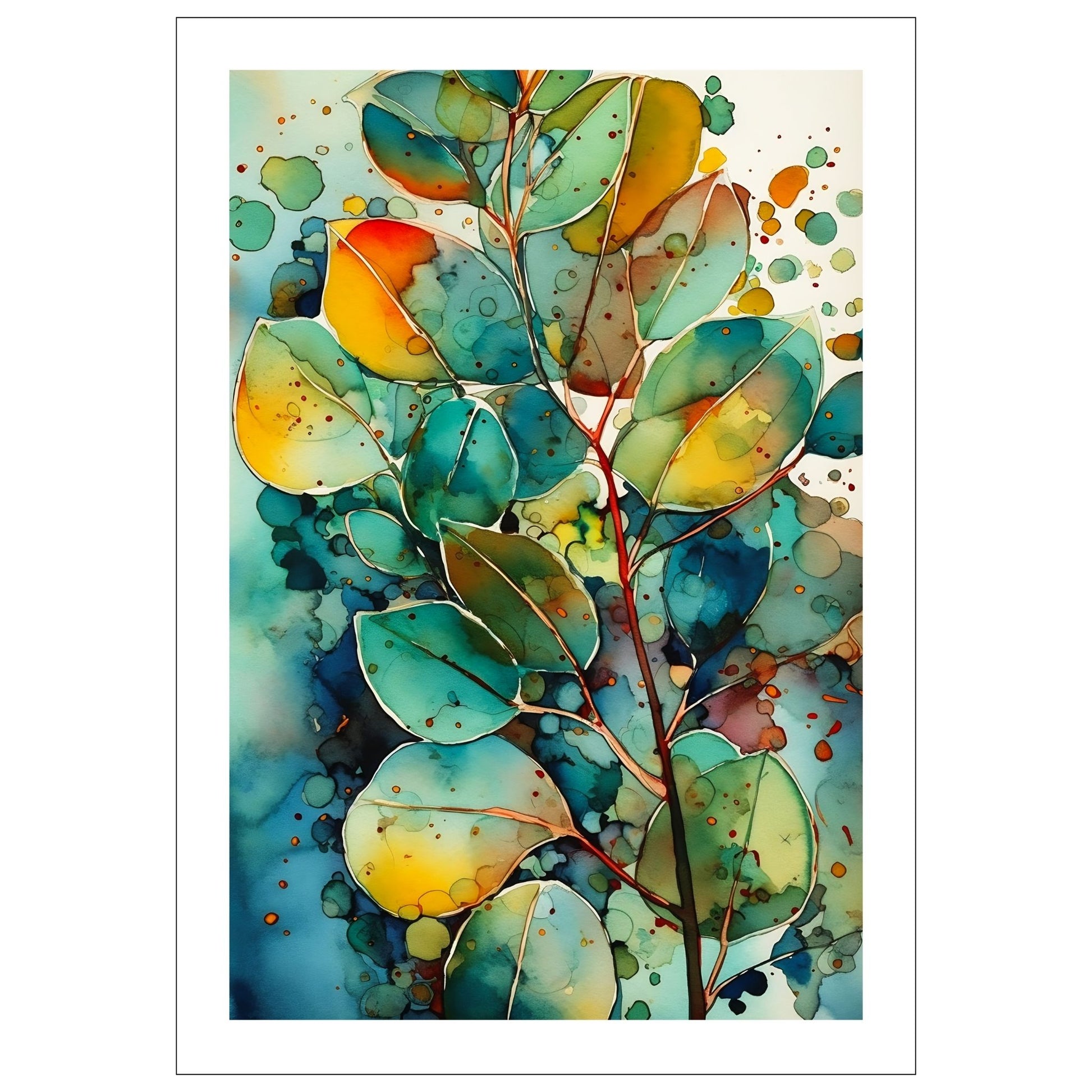Nøkkelord: Eucalyptus Leaves, plakat, lerret, grafisk, abstrakt, akvarell, blågrønne, gule.