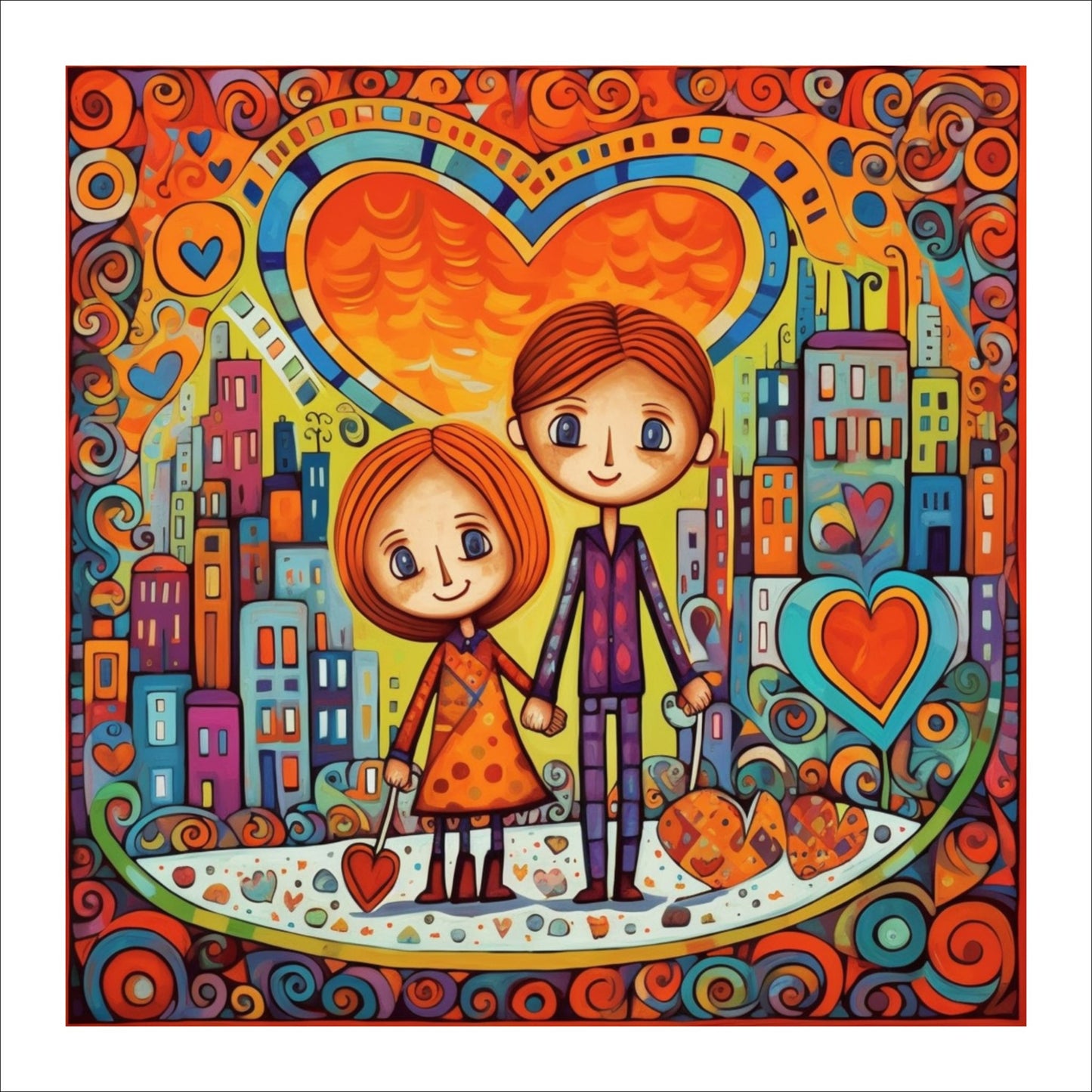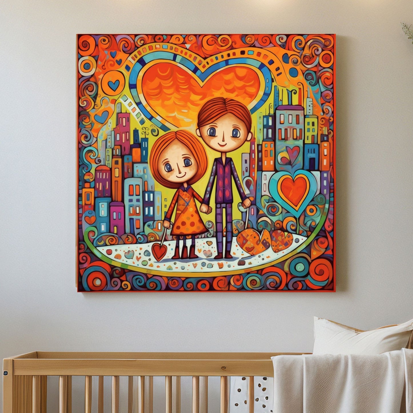 Denne fargerike grafiske plakaten fremstilt med kunstig intelligens (KI) bringer til live en sjarmerende scene hvor en gutt og jente går hånd i hånd gjennom en livlig fantasiby. Perfekt for å lyse opp ethvert rom, "Gode Venner" plakat og lerret er et ideelt valg for barnerom, lekerom eller som en fargerik dekorasjon i hjemmet ditt.