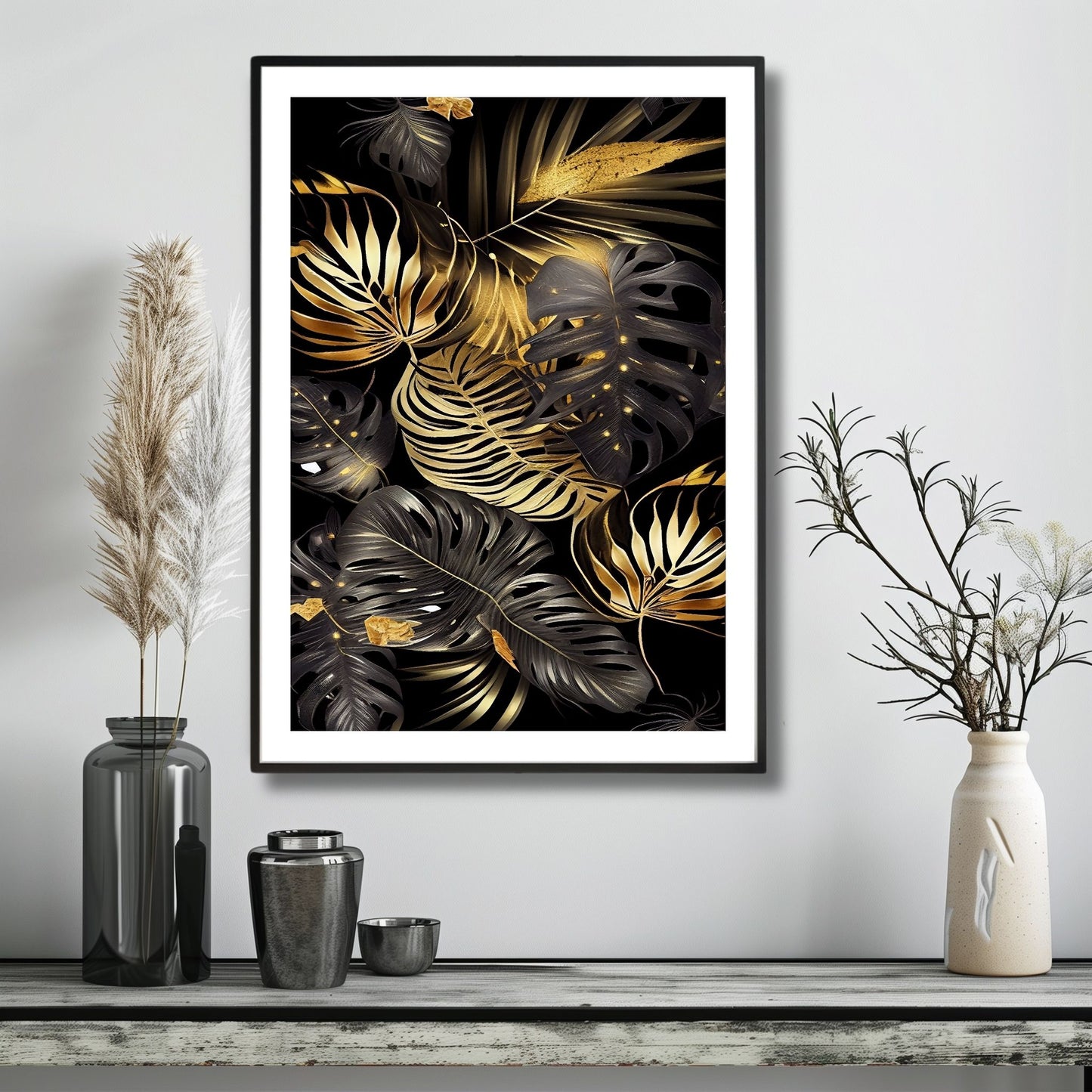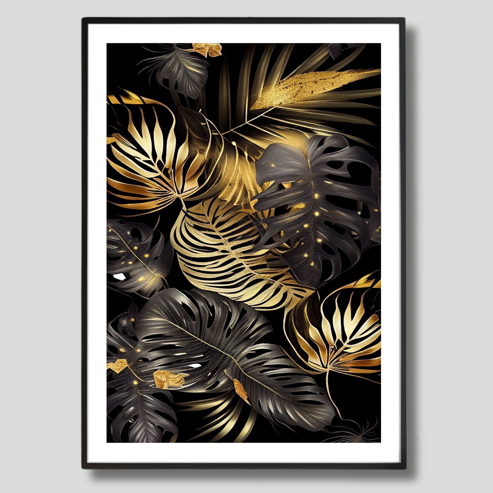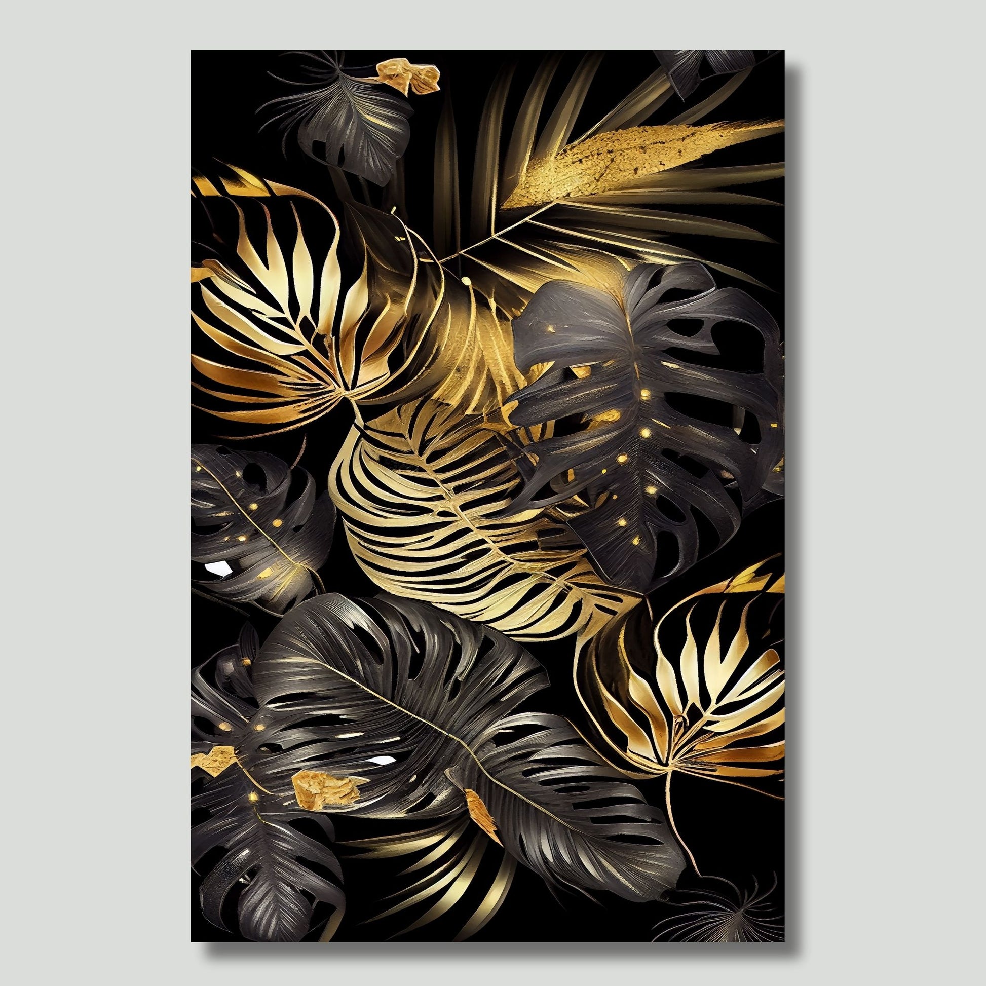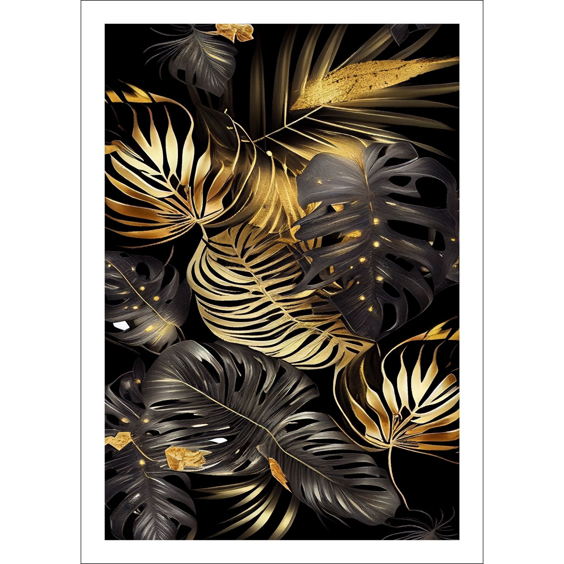 Dette kunstverket fanger oppmerksomheten med sine abstrakte gullpenselstrøk mot en dyp, sort bakgrunn, som fremhever detaljene i de delikate bladmotivene. "Golden Modern Art No3" er ideell for deg som ønsker en sofistikert dekorasjon som tilfører et snev av luksus til rommet.