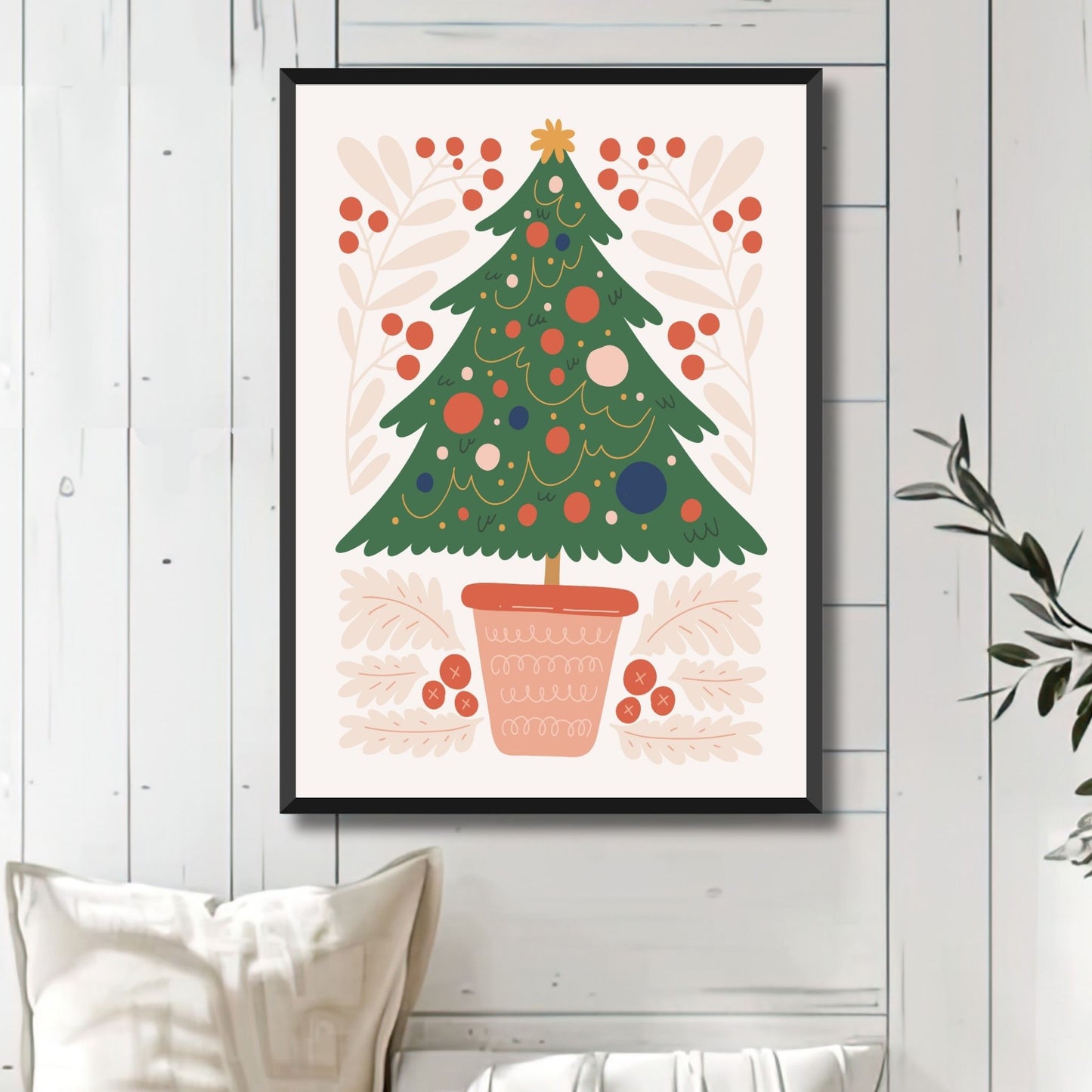 "Juletre i Potte" er en koselig plakat som viser et pyntet juletre stående i en potte, omgitt av bær og grener