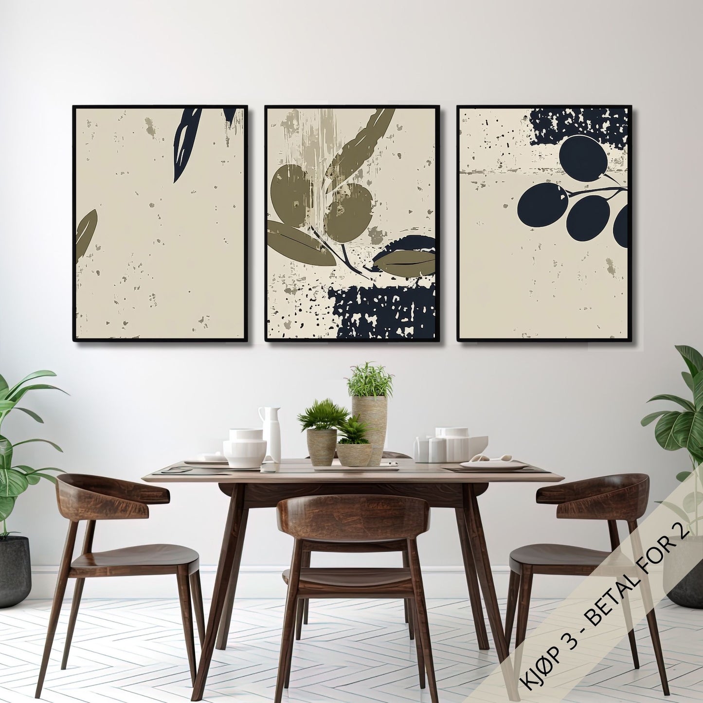 Gi hjemmet ditt et stilrent og naturlig preg med "Olive Grove Art Collection" – et vakkert sett bestående av tre abstrakte motiver