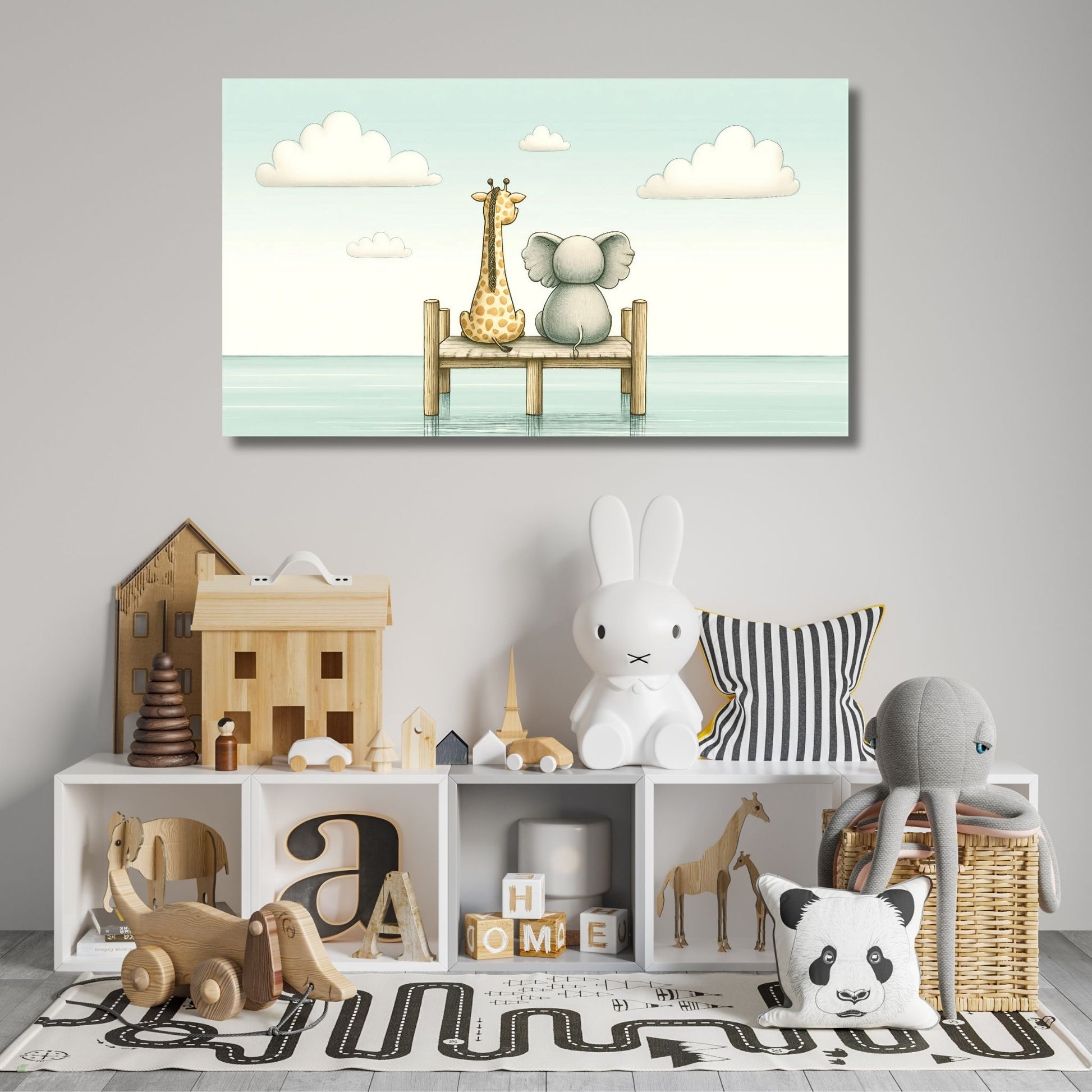 Skap en følelse av ro og vennskap i ditt hjem med denne sjarmerende plakaten eller lerretet som viser en sjiraff og en elefant som sitter sammen på en brygge, og nyter utsikten over vannet.