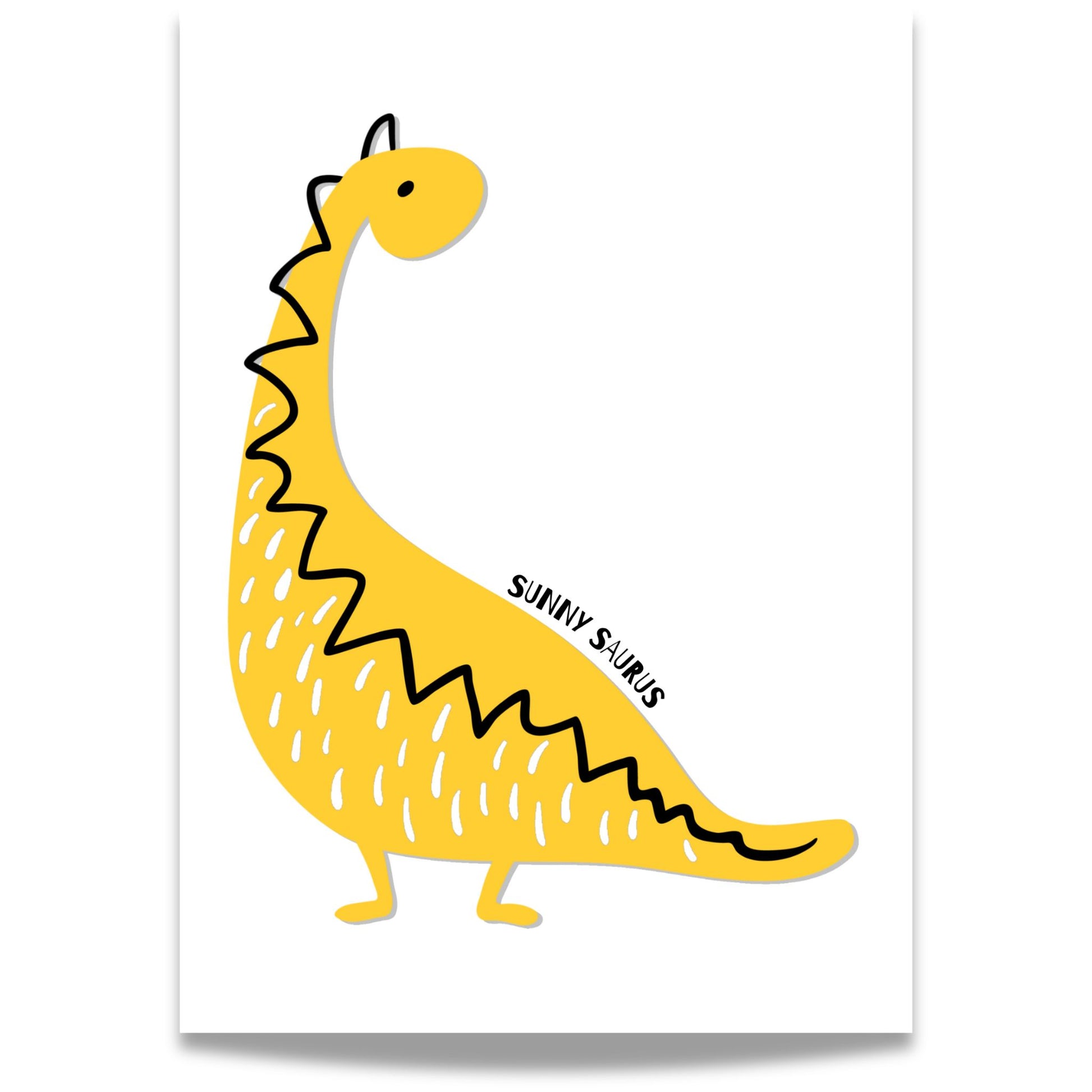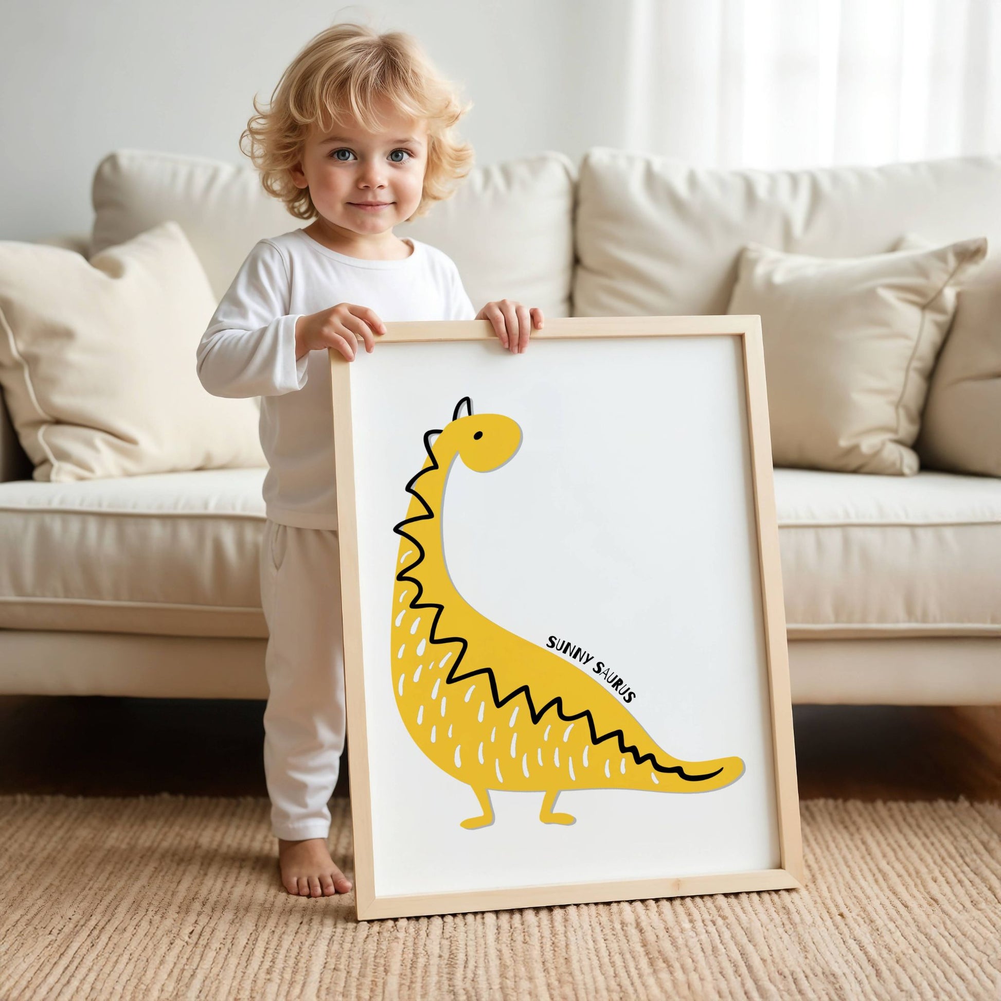 Sunny Saurus dinosaurplakat og alfabetplakat med lys bakgrunn  i eik ramme