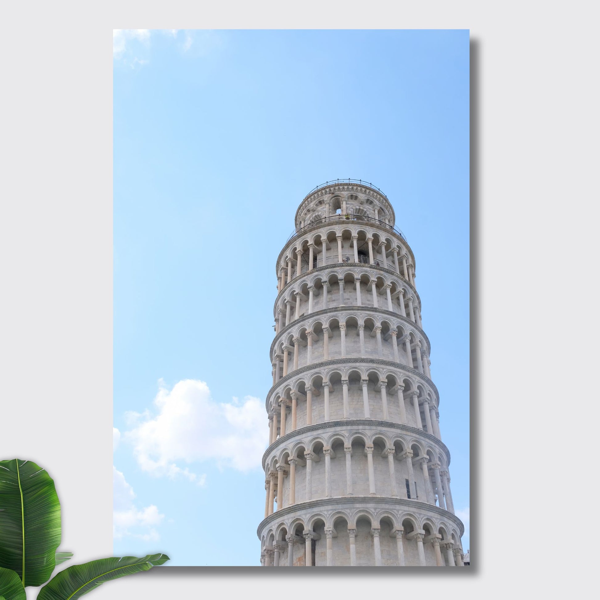 Dette motivet fremhever de elegante buene og detaljene i det ikoniske skjeve tårnet, sett mot en klar himmel. Med sin majestetiske arkitektur og unike struktur er dette kunstverket en hyllest til italiensk design og historie.