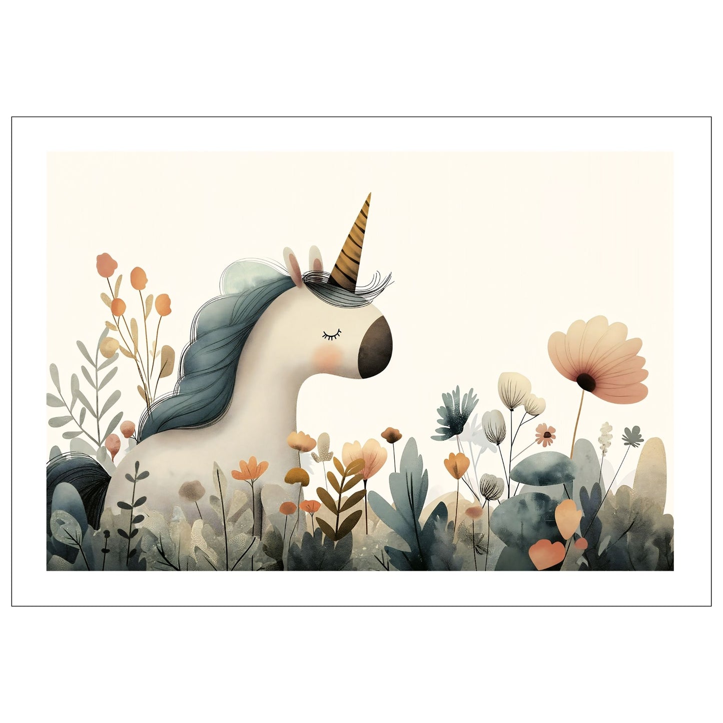Dette sjarmerende bildet av en søt enhjørning i en blomstereng er det andre av en serie på tre, perfekt for å skape en fantasifull atmosfære i ethvert barns rom.